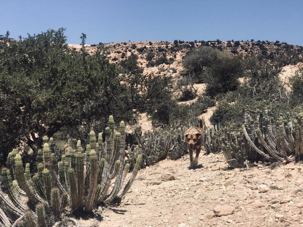 Przedgórza Atlasu koło mojego domu, to miejsce na złapanie oddechu od betonowych ścian. Wydeptane, kozie ścieżki w miękkich, wapiennych skałach i dróżki dla wiewiórek pomiędzy kaktusami po których często „skaczemy” z psem podczas kwarantanny. Podczas tych spacerów towarzyszą mi Wiatr i Słońce. Tylko oni zakłócają co chwilę ciszę wokół mnie 🙂