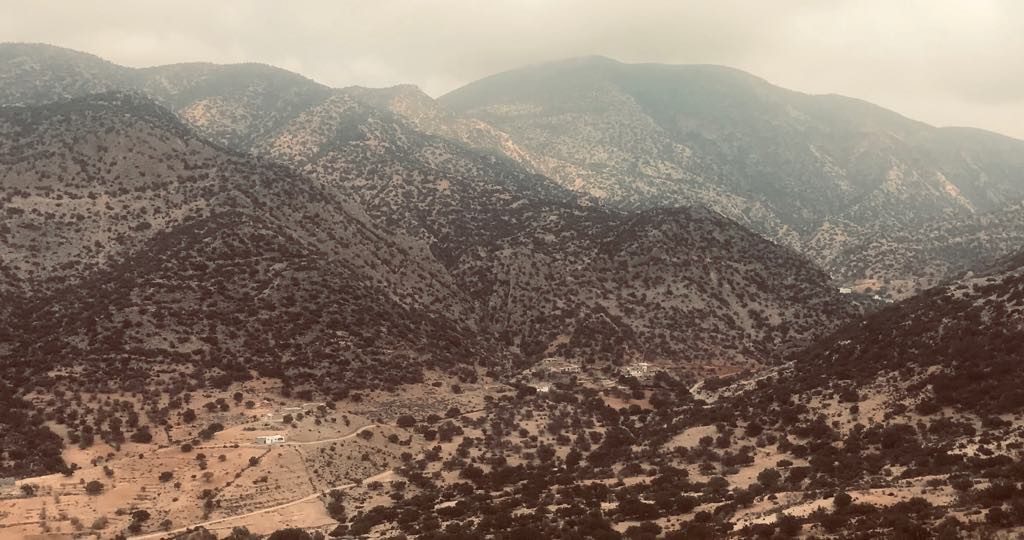 Najwspanialszy, wyniosły , kolorowy , pełen sekretów Atlas jest dzisiaj poddawany wodnej terapii znad Oceanu. Nogi ledwo widać, tak szczelnie otulone przez wilgotne kłębiące się opary wodne. Taki sens w hammamie, tylko że zamiast gorących oparów, buchają zimne. Wkradają się przez uchylone okno do domu i oblepiają orzeźwiającą bryzą kafelki na podłodze .